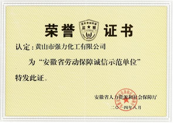 为表彰先进,树立典型,在全社会营造用人单位自我规范、自我约束、诚实守信的良好氛围,不断强化用人单位劳动保障管理。黄山市强力化工有限公司在签订履行劳动合同、缴纳社会保险费、规范用工行为等方面取得显著成绩,被授予“安徽省劳动保障诚信示范单位”称号。