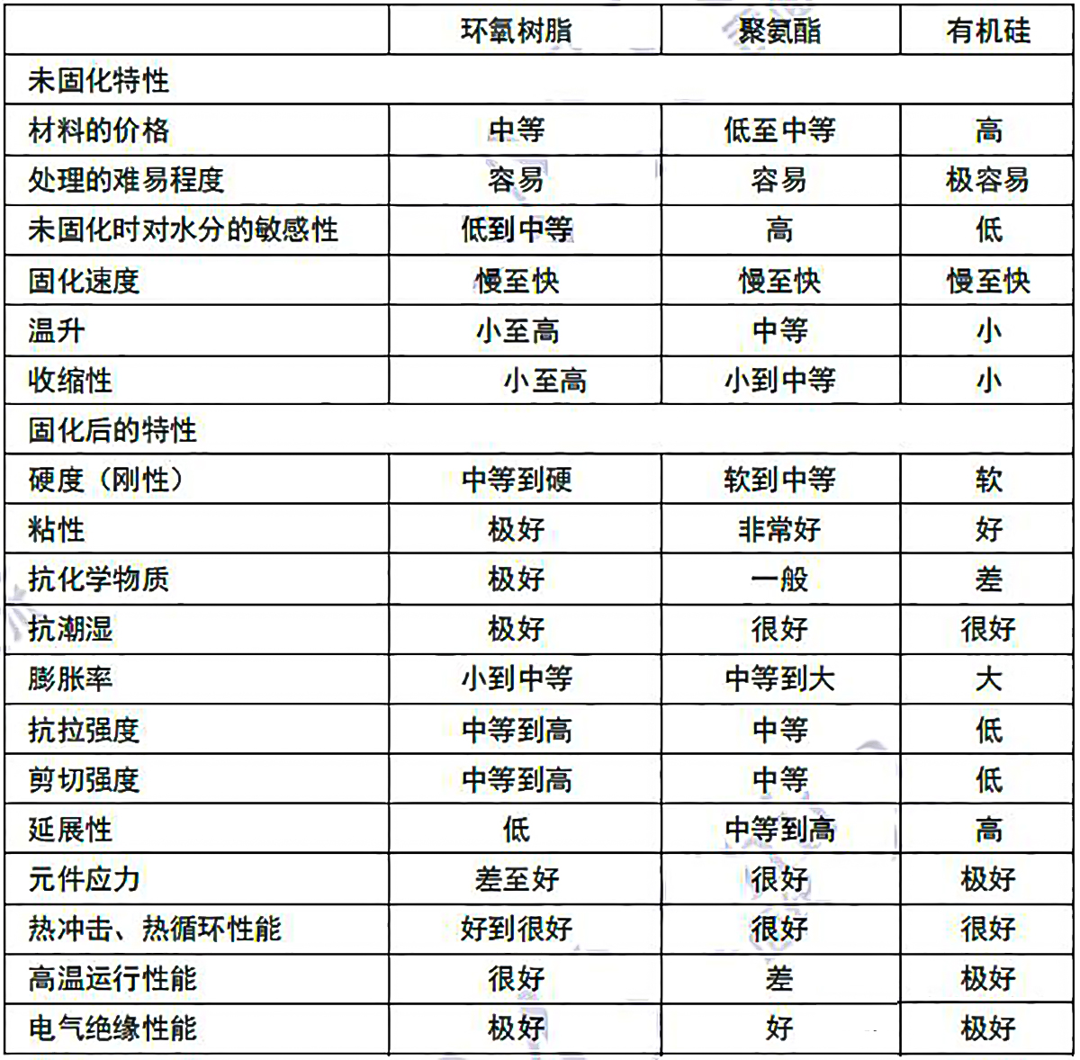工艺性: 环氧树脂>有机硅树脂>聚氨酯;