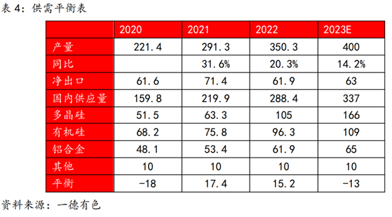 2023年预计工业硅产量400万吨,同比增长14.2%左右,2023年工业硅净出口预估63万吨,多晶硅消费大幅度提升至166万吨,有机硅行业预估消费量109万吨,全年国内消费350万吨,增速28%,全年紧缺13万吨,不过由于多晶硅产量释放周期长,因此预计2023年上半年工业硅仍将面临压力。