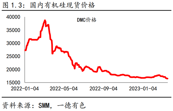 据统计2023年1-2月份中国DMC产量34.18万吨,累计同比增长31.8%,2022年底由于下游消费疲软,有机硅企业进行主动的检修减产,开工率及产量均出现了明显的下滑。2023年春节后,随着疫情的放开市场情绪的好转,终端消费复苏有机硅行业成本库存压力减小,价格有所回升,但涨势并未持续,小企业受迫于生存压力出现降价卖货的情况。行业洗牌依旧持续,新疆合盛持续投产,个别小企业负荷仍在降低,不过市场整体货源供应持续增加。