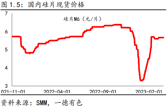2023年1-2月份中国多晶硅产量20.4万吨,累计同比增长102%,预计2023年国内规划新增产能达到133万吨,因此2023年国内多晶硅产量130万吨,同比增长60%。2023年一季度新增产能10-15万吨,二季度新增产能30万吨,三季度新增产能50万吨,四季度新增产能10万吨,由于投产后需要2-3个月出产品,产品爬坡期为3-6个月,因此下半年多晶硅产量贡献较多。