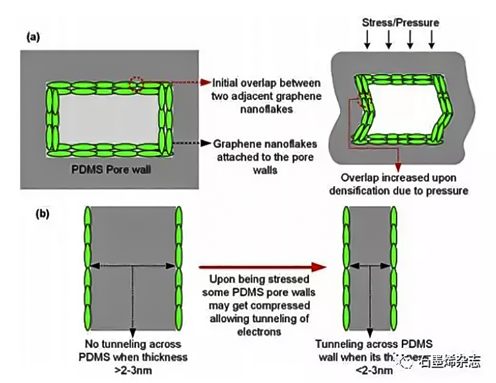 3. 石墨烯-PDMS泡沫传感器中可能的应变诱导电阻调制机制的示意图:(a)传感器中观察到的应变诱导电阻调制的导电域断开机制的示意图;(b)应力诱导隧穿电阻调制的示意图。
