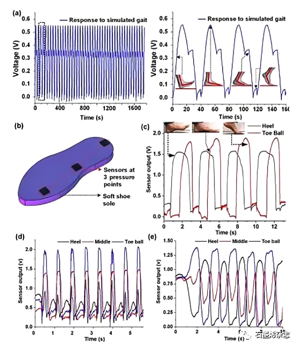 针对个性化医疗监护的需求,对柔性、超敏、可挤压、可贴装和可穿戴传感器的需求日益增长,因此有必要探索基于纳米聚合物复合材料的新型传感器。下面介绍一下关于敏感的3D可压缩石墨烯-聚二甲基硅氧烷(PDMS)泡沫压阻传感器。该传感器通过将多层石墨烯纳米颗粒注入糖基多孔PDMS泡沫结构中来实现。所制得的压阻式泡沫塑料传感器的静态和动态压缩应变测试结果显示,在0-50%的应变范围内,存在两个线性响应区域,平均应变因子为2.87~8.77。此外,动态刺激响应揭示了传感器的能力,有效地跟踪动态压力高达70赫兹的频率。该传感器在36000次循环压缩载荷和100次完整的人类步态运动周期中显示出很高的稳定性。通过仿真步态模型和实时步态表征实验,3D传感泡沫体可精确的对人体步态进行监测。实时步态实验表明,鞋底三个位置的压力分布信息不仅可以区分步行和跑步等不同的人类步态,还可以识别可能的跌倒情况。本论文还展示了传感器区分足部解剖结构的能力,如扁平足(低中心弓)和中弓脚,这是更有效的生物力学。此外,传感器能够感知各种基本的关节运动反应,证明它们适合于个性化医疗应用。