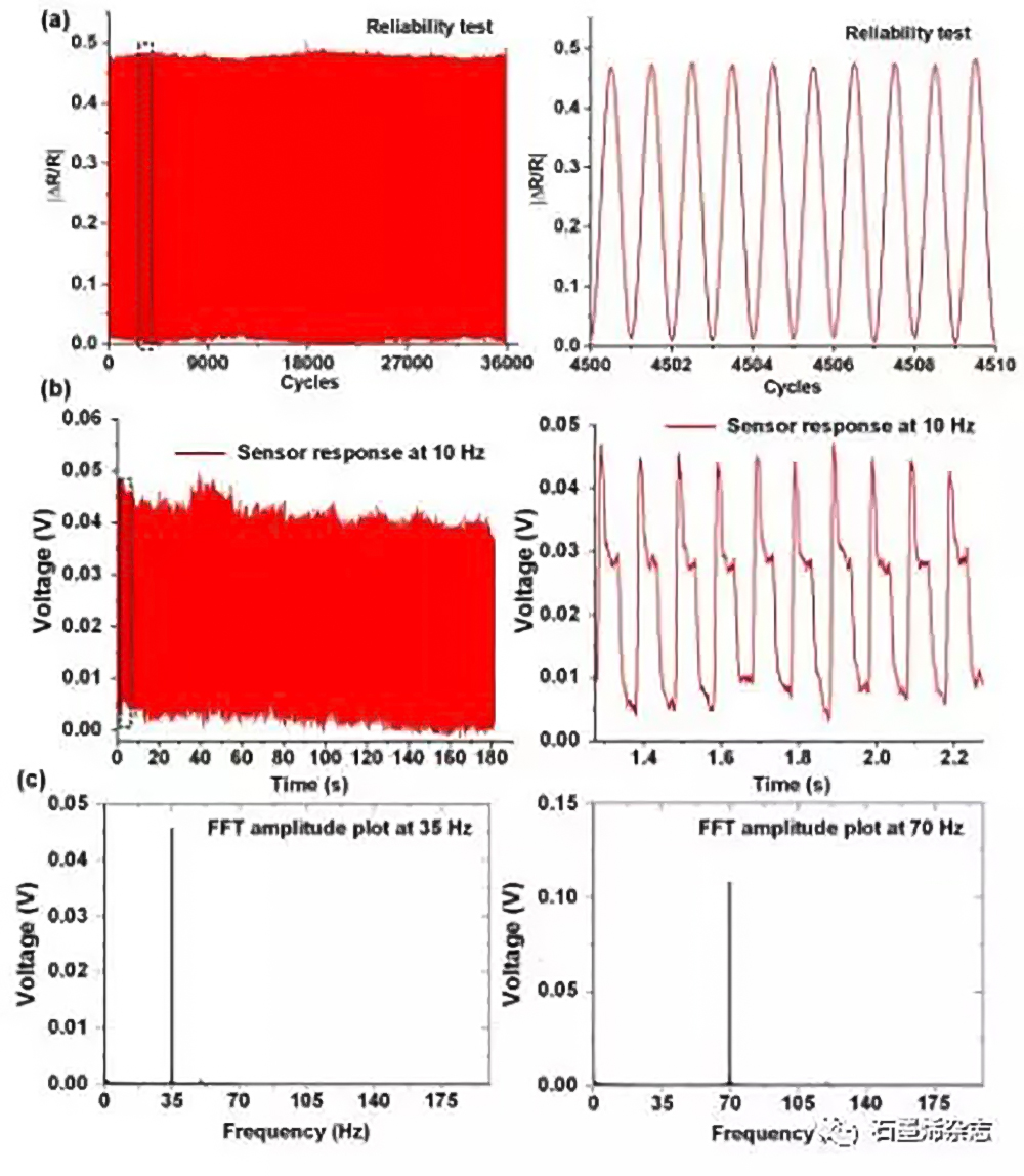 5. 循环压缩加载和动态应变传感特性的石墨烯泡沫塑料传感器:(a)传感器在5%压缩应变下对循环加载和卸载的响应;(b)传感器在10 Hz时时域响应的曲线图;(c)在35 Hz和70 Hz时传感器响应的FFT振幅图。