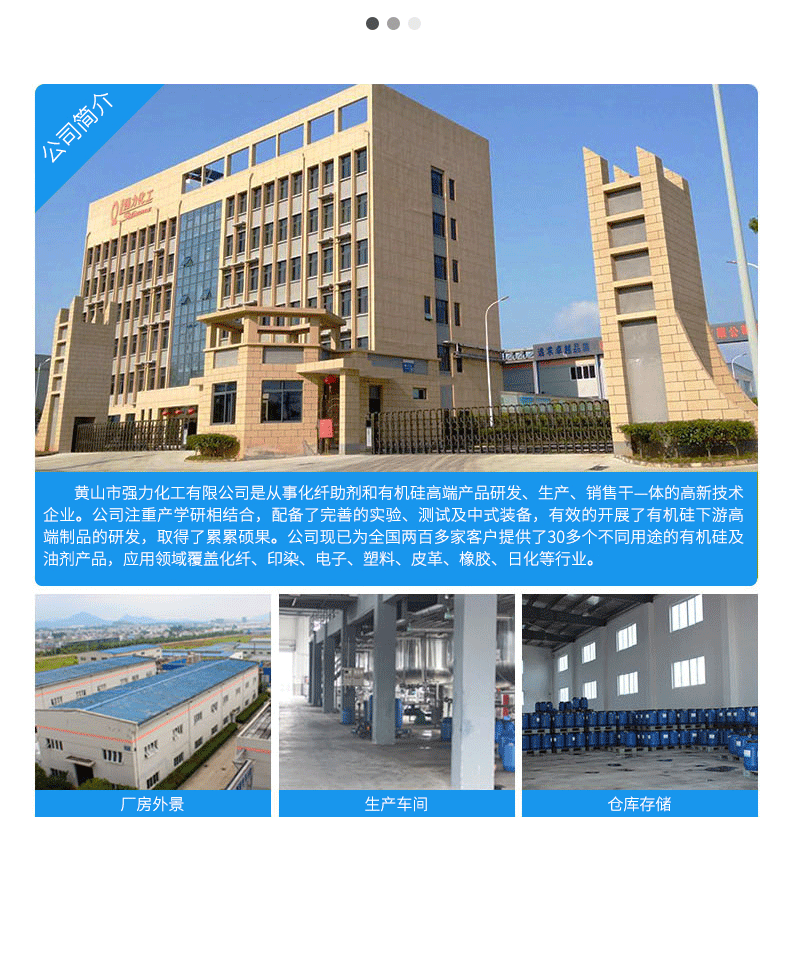 黄山市强力化工有限公司是一家专注于有机硅新材料,集研发、生产与销售为一体的综合性高新技术企业。公司已是有机硅行业内较为知名的品牌,倾力于打造高品质有机硅产品:二甲基硅油、乙烯基硅油、氨基硅油、乳化硅油、羟基硅油、含氢硅油与纺织品硅油等。砥砺前行,踔厉奋发,强力纯硅油,更高技术,更好硅油。