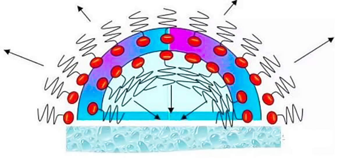 含疏水粒子的消泡剂有第三个机制。这些疏水粒子到达薄层的表面,而且在薄层的顶端吸附表面活性剂。薄层由于表面活性剂的缺失而破裂。